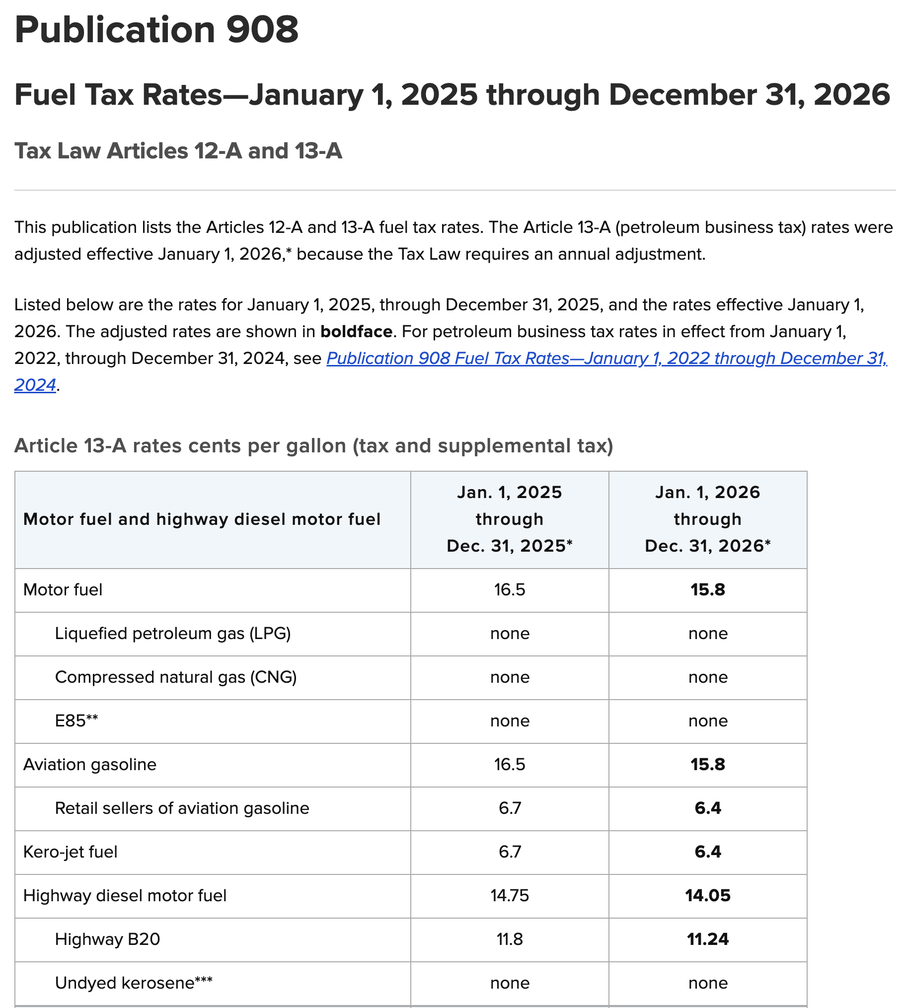 This publication lists the Articles 12-A and 13-A fuel tax rates. The Article 13-A (petroleum business tax) rates were adjusted effective January 1, 2026,* because the Tax Law requires an annual adjustment.