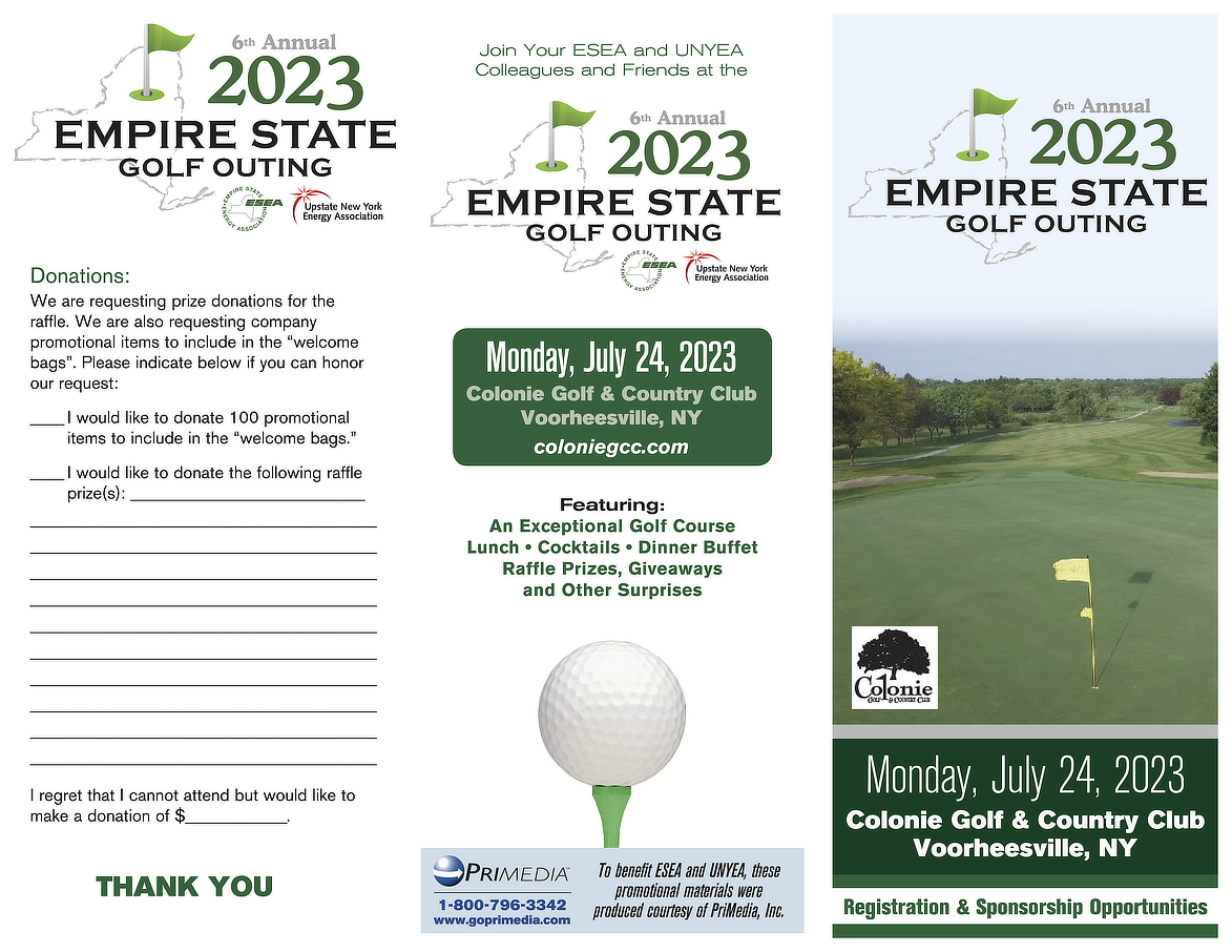 The Empire State Energy Association and the Upstate New York Energy Association are happy to bring their members the 6th Annual 2023 EMPIRE STATE GOLF OUTING on Monday, July 24 at the Colonie Golf & Country Club located at 141 Maple Road, Route 85A, Voorheesville, New York.
